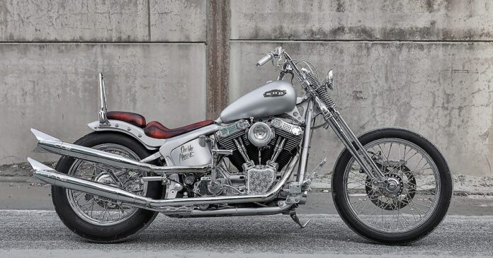 The Edelweiss Chopper sports a monochromatic color scheme, with a focus on polished parts and intricate details. BK-Lack GmbH laid down the Porsche Ice Silver paint, while Chiko’s Pinstriping added lettering to the oil tank. Finally, Carsten Estermann engraved the gas cap, primary cover, rocker boxes, and cam cover with elaborate illustrations.